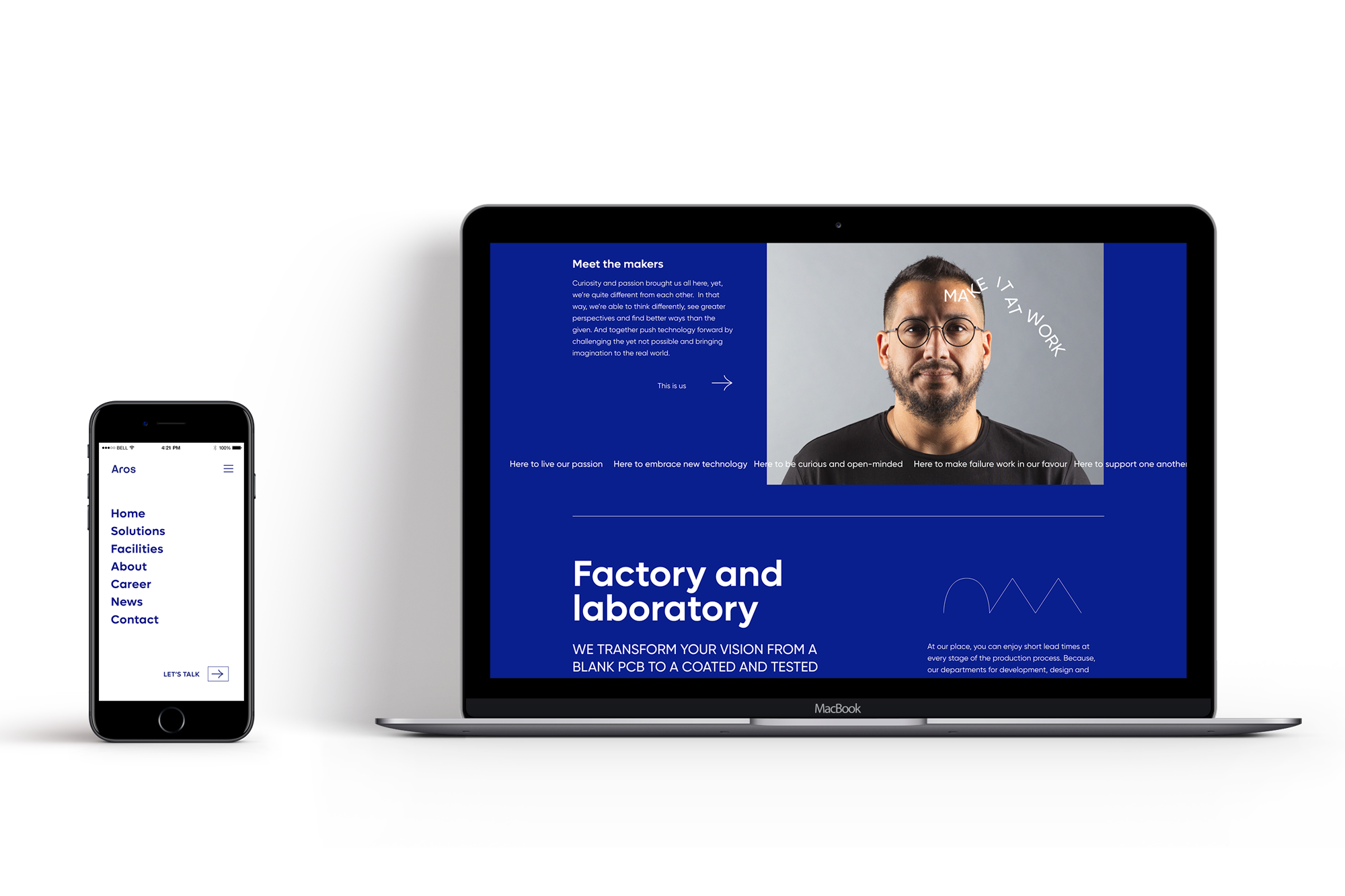 We developed the concept “Innovation in motion” — a theme that not only reflects the mechatronic essence of Aros, but also the energy and freedom that define its culture. At its core lies a double meaning in “make it happen”: for team members, the possibility to realize their own ideas and dreams, and for Aros as a company, the ability to transform innovation into tangible solutions.